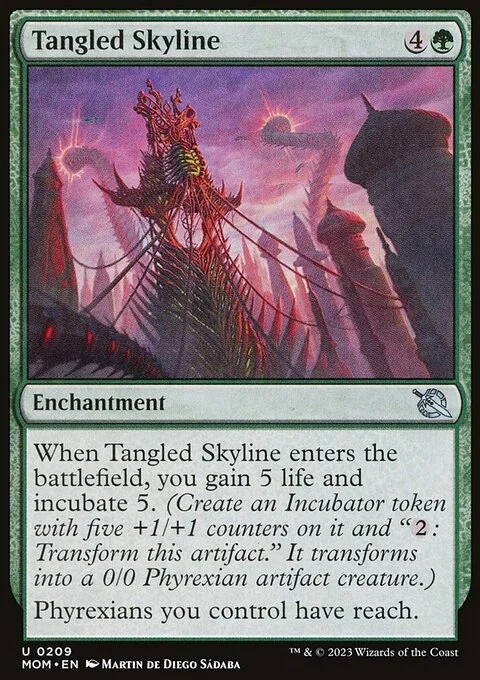 When Tangled Skyline enters the battlefield, you gain 5 life and incubate 5. (Create an Incubator token with five +1/+1 counters on it and "{2}: Transform this artifact." It transforms into a 0/0 Phyrexian artifact creature.) Phyrexians you control have reach.