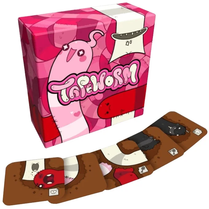 From designer Edmund McMillen, Tapeworm is a game in which players compete to build tapeworms and empty their hands of tiles, in the form of cards.