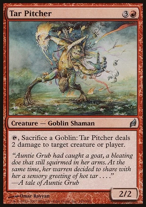 {T}, Sacrifice a Goblin: Tar Pitcher deals 2 damage to any target.