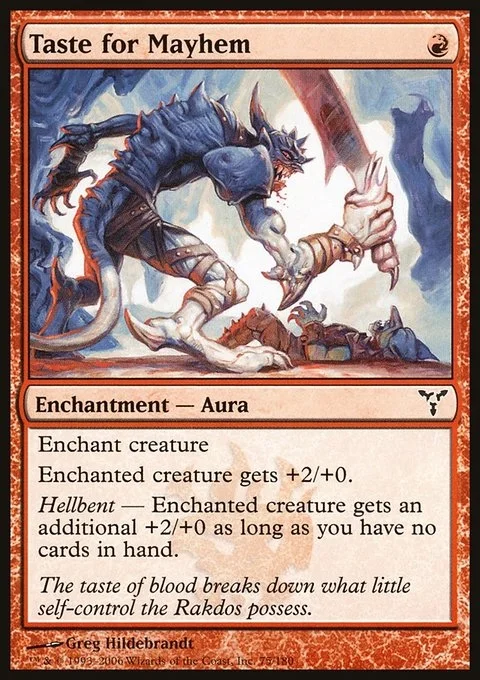Enchant creature Enchanted creature gets +2/+0. Hellbent — Enchanted creature gets an additional +2/+0 as long as you have no cards in hand.