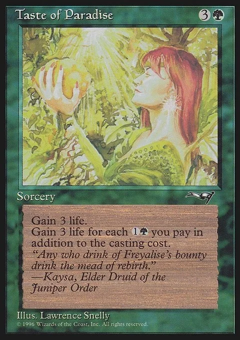 As an additional cost to cast this spell, you may pay {1}{G} any number of times. You gain 3 life plus an additional 3 life for each additional {1}{G} you paid.