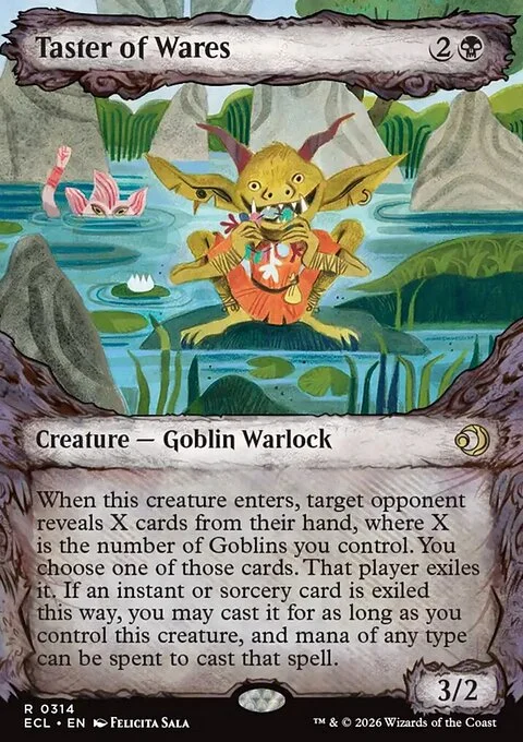 When this creature enters, target opponent reveals X cards from their hand, where X is the number of Goblins you control. You choose one of those cards. That player exiles it. If an instant or sorcery card is exiled this way, you may cast it for as long as you control this creature, and mana of any type can be spent to cast that spell.