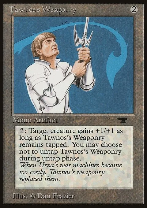 2: Target creature gains +1/+1 as long as Tawnos’s Weaponry remains tapped. You may choose not to untap Tawnos’s Weaponry during untap phase.