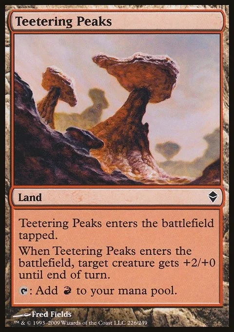 Teetering Peaks enters the battlefield tapped. When Teetering Peaks enters the battlefield, target creature gets +2/+0 until end of turn. {T}: Add {R}.