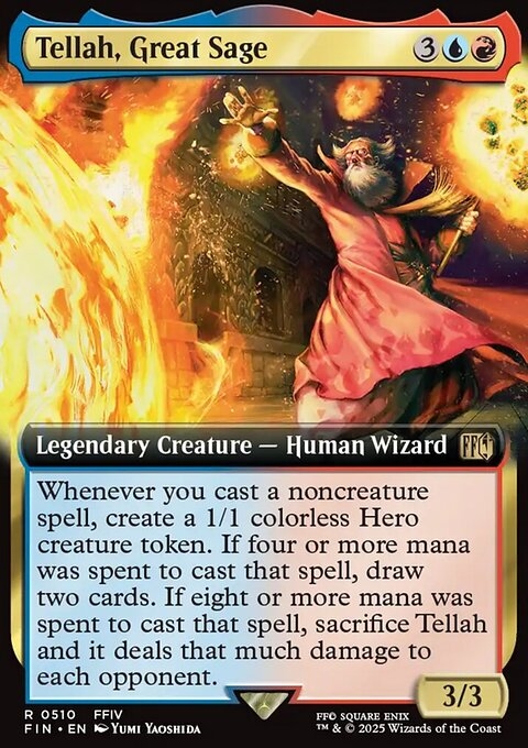 Whenever you cast a noncreature spell, create a 1/1 colorless Hero creature token. If four or more mana was spent to cast that spell, draw two cards. If eight or more mana was spent to cast that spell, sacrifice Tellah and it deals that much damage to each opponent.