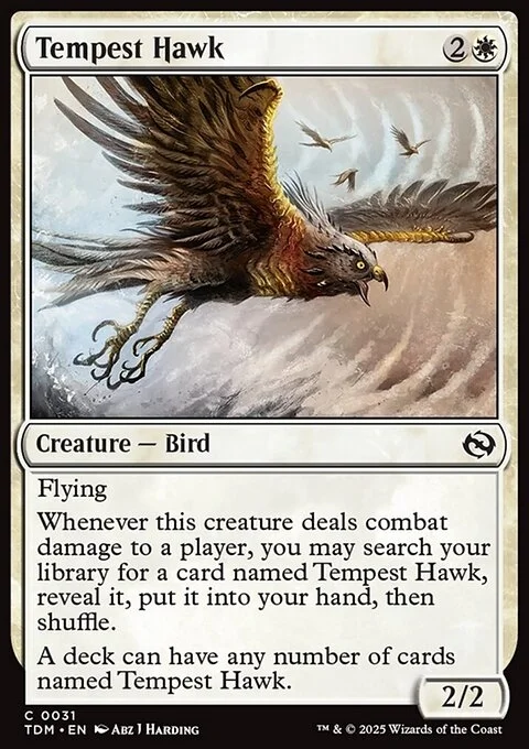 Flying Whenever this creature deals combat damage to a player, you may search your library for a card named Tempest Hawk, reveal it, put it into your hand, then shuffle. A deck can have any number of cards named Tempest Hawk.