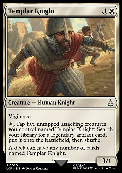 Vigilance {W}, Tap five untapped attacking creatures you control named Templar Knight: Search your library for a legendary artifact card, put it onto the battlefield, then shuffle. A deck can have any number of cards named Templar Knight.