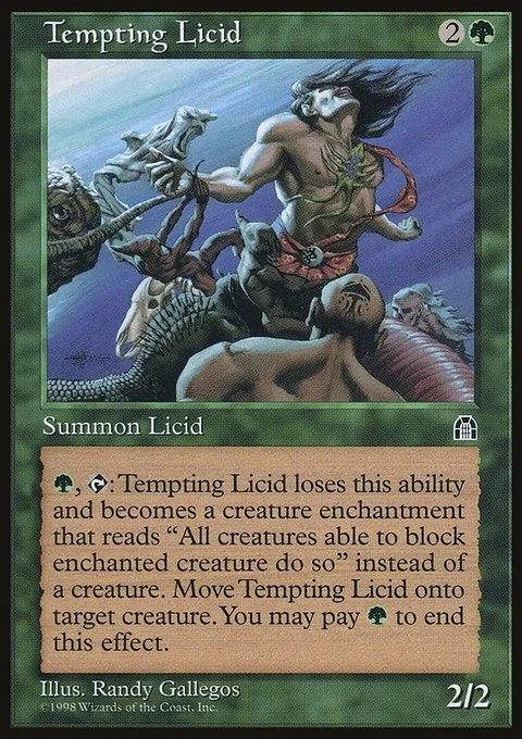 G, T: Tempting Licid loses ability and becomes a creature enchantment that reads “All creatures able to block enchanted creature do so” instead of a creature. Move Tempting Licid onto target creature. You may pay G to end this effect.
