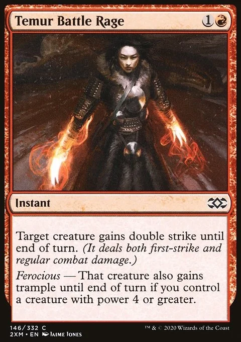 Target creature gains double strike until end of turn. Ferocious — That creature also gains trample until end of turn if you control a creature with power 4 or greater.