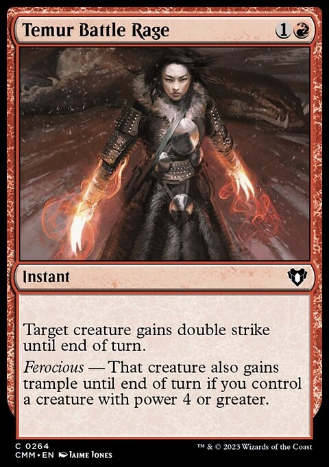 Target creature gains double strike until end of turn. Ferocious — That creature also gains trample until end of turn if you control a creature with power 4 or greater.