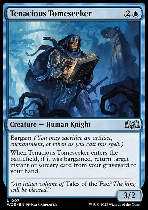 Bargain (You may sacrifice an artifact, enchantment, or token as you cast this spell.) When Tenacious Tomeseeker enters the battlefield, if it was bargained, return target instant or sorcery card from your graveyard to your hand.