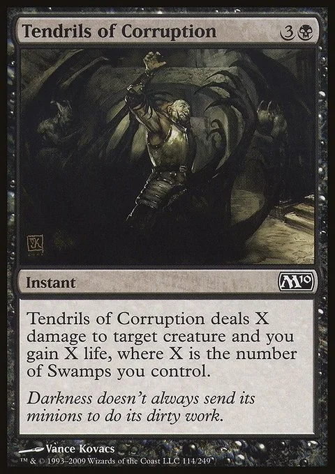Tendrils of Corruption deals X damage to target creature and you gain X life, where X is the number of Swamps you control.
