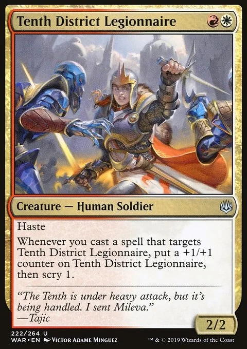 Haste Whenever you cast a spell that targets Tenth District Legionnaire, put a +1/+1 counter on Tenth District Legionnaire, then scry 1.