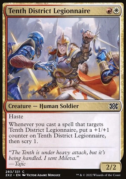 Haste Whenever you cast a spell that targets this creature, put a +1/+1 counter on this creature, then scry 1.