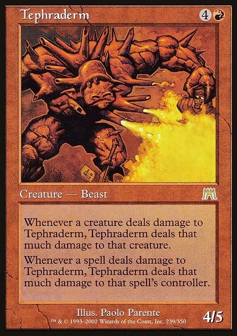 Whenever a creature deals damage to Tephraderm, Tephraderm deals that much damage to that creature. Whenever a spell deals damage to Tephraderm, Tephraderm deals that much damage to that spell's controller.
