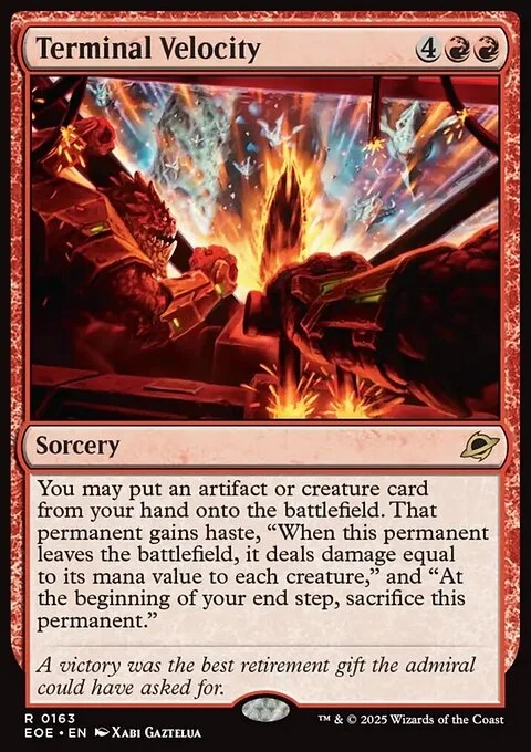 You may put an artifact or creature card from your hand onto the battlefield. That permanent gains haste, "When this permanent leaves the battlefield, it deals damage equal to its mana value to each creature," and "At the beginning of your end step, sacrifice this permanent."
