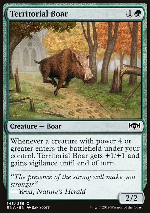 Whenever a creature with power 4 or greater enters the battlefield under your control, Territorial Boar gets +1/+1 and gains vigilance until end of turn.