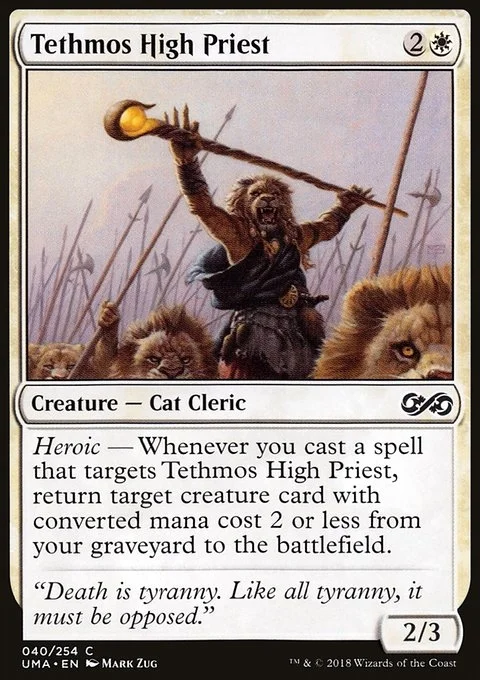 Heroic — Whenever you cast a spell that targets Tethmos High Priest, return target creature card with converted mana cost 2 or less from your graveyard to the battlefield.