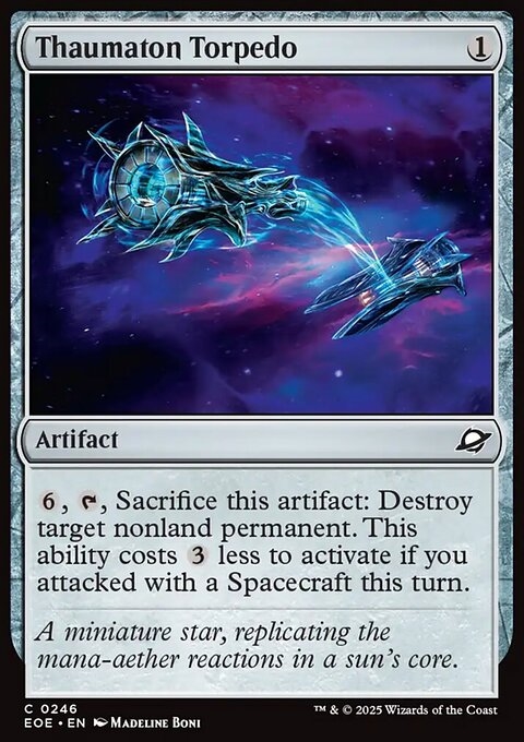 {6}, {T}, Sacrifice this artifact: Destroy target nonland permanent. This ability costs {3} less to activate if you attacked with a Spacecraft this turn.
