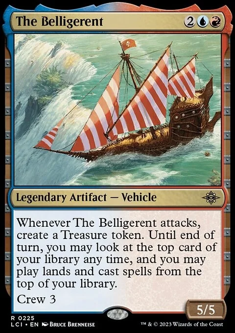 Whenever The Belligerent attacks, create a Treasure token. Until end of turn, you may look at the top card of your library any time, and you may play lands and cast spells from the top of your library. Crew 3