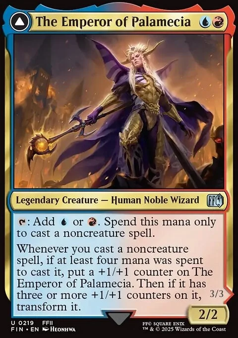 Whenever you cast a noncreature spell, if at least four mana was spent to cast it, put a +1/+1 counter on The Emperor of Palamecia. Then if it has three or more +1/+1 counters on it, transform it.