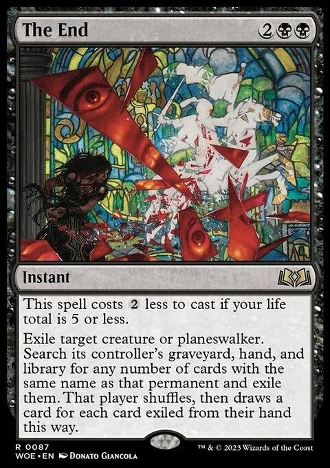 Exile target creature or planeswalker. Search its controller's graveyard, hand, and library for any number of cards with the same name as that permanent and exile them. That player shuffles, then draws a card for each card exiled from their hand this way.