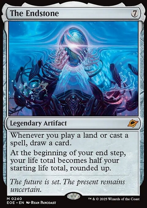 Whenever you play a land or cast a spell, draw a card. At the beginning of your end step, your life total becomes half your starting life total, rounded up.