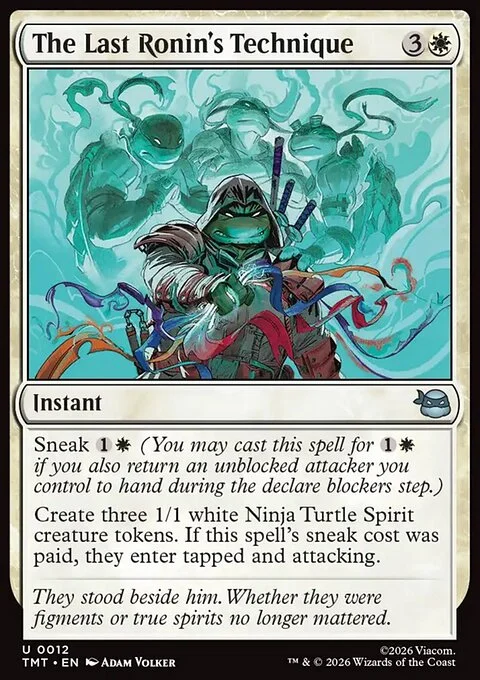 Sneak {1}{W} (You may cast this spell for {1}{W} if you also return an unblocked attacker you control to hand during the declare blockers step.) Create three 1/1 white Ninja Turtle Spirit creature tokens. If this spell's sneak cost was paid, they enter tapped and attacking.