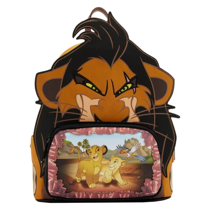 Claim what is rightfully yours with the Loungefly Lion King Scar Villains Scene Mini Backpack. Scar is ready to pounce on Simba, Nala, and Zazu, who are exploring an elephant graveyard on the front zipper pocket. Turn the backpack around and you will find that Scar's feet and tail are poised to attack! Opening the front pocket will reveal Scar's full mischievous grin. This fashionable accessory adds a dash of villainy to any outfit and will help you stay prepared for any scheme.