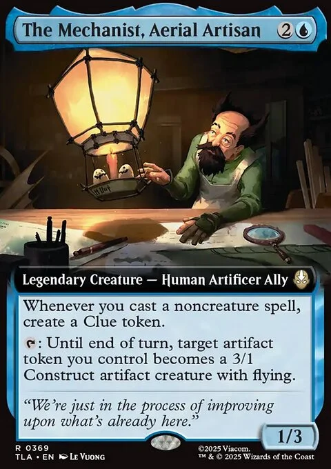 Whenever you cast a noncreature spell, create a Clue token. (It's an artifact with "{2}, Sacrifice this token: Draw a card.") {T}: Until end of turn, target artifact token you control becomes a 3/1 Construct artifact creature with flying.
