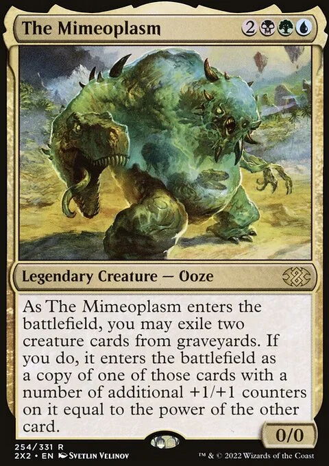 As The Mimeoplasm enters, you may exile two creature cards from graveyards. If you do, it enters as a copy of one of those cards with a number of additional +1/+1 counters on it equal to the power of the other card.