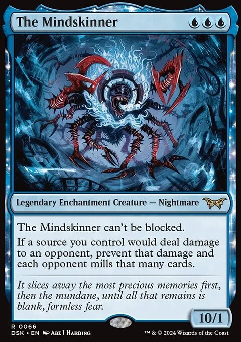 The Mindskinner can't be blocked. If a source you control would deal damage to an opponent, prevent that damage and each opponent mills that many cards.