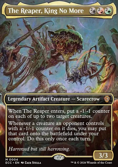 When The Reaper enters, put a -1/-1 counter on each of up to two target creatures. Whenever a creature an opponent controls with a -1/-1 counter on it dies, you may put that card onto the battlefield under your control. Do this only once each turn.