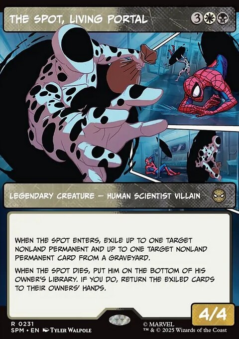 When The Spot enters, exile up to one target nonland permanent and up to one target nonland permanent card from a graveyard. When The Spot dies, put him on the bottom of his owner's library. If you do, return the exiled cards to their owners' hands.