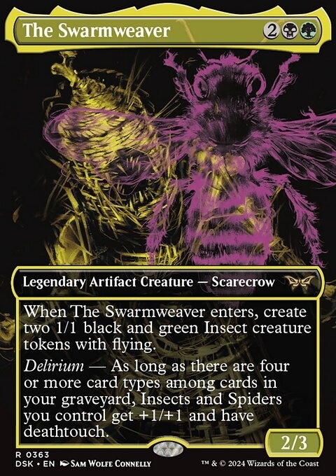 When The Swarmweaver enters, create two 1/1 black and green Insect creature tokens with flying. Delirium — As long as there are four or more card types among cards in your graveyard, Insects and Spiders you control get +1/+1 and have deathtouch.
