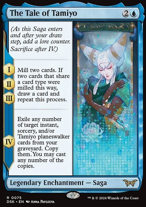 IV — Exile any number of target instant, sorcery, and/or Tamiyo planeswalker cards from your graveyard. Copy them. You may cast any number of the copies.