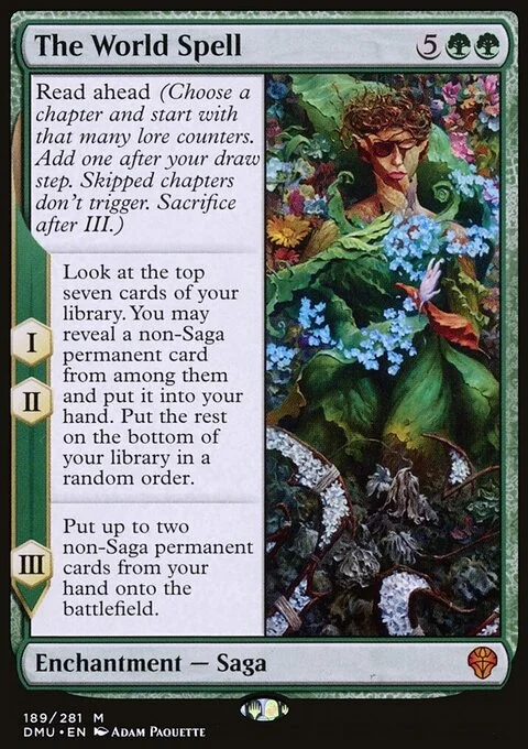 Read ahead (Choose a chapter and start with that many lore counters. Add one after your draw step. Skipped chapters don't trigger. Sacrifice after III.) I, II — Look at the top seven cards of your library. You may reveal a non-Saga permanent card from among them and put it into your hand. Put the rest on the bottom of your library in a random order. III — Put up to two non-Saga permanent cards from your hand onto the battlefield.