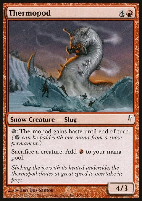 {S}: Thermopod gains haste until end of turn. ({S} can be paid with one mana from a snow source.) Sacrifice a creature: Add {R}.