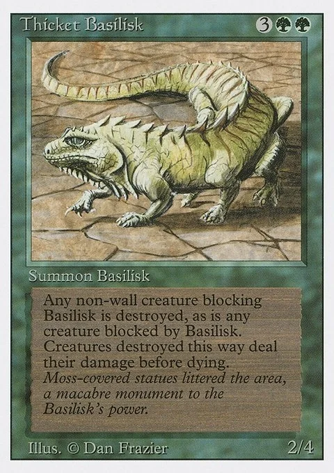 Any non-wall creature blocking Basilisk is destroyed, as is any creature blocked by Basilisk. Creatures destroyed this way deal their damage before dying.