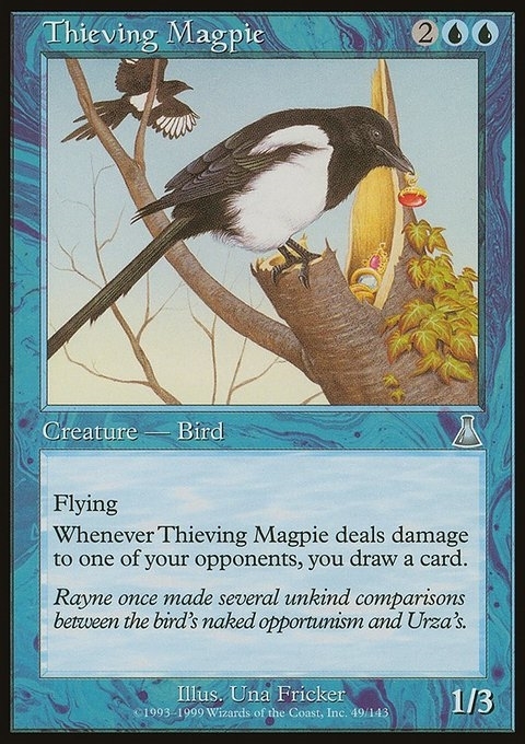 Flying Whenever Thieving Magpie deals damage to one of your opponents, you draw a card.