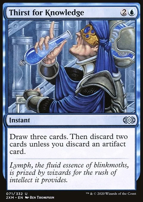 Draw three cards. Then discard two cards unless you discard an artifact card.