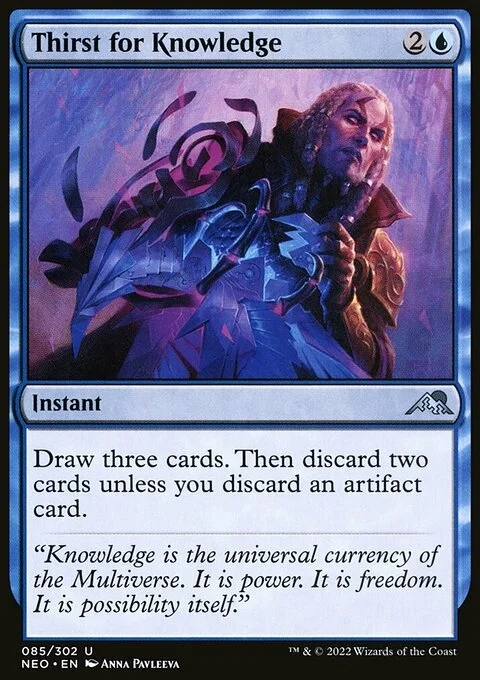 Draw three cards. Then discard two cards unless you discard an artifact card.