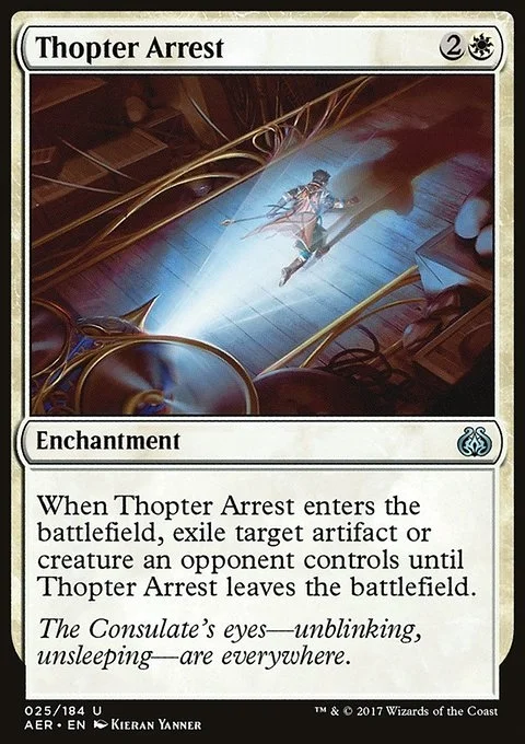 When Thopter Arrest enters the battlefield, exile target artifact or creature an opponent controls until Thopter Arrest leaves the battlefield.