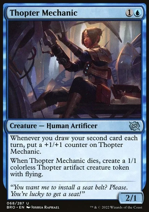 Whenever you draw your second card each turn, put a +1/+1 counter on Thopter Mechanic. When Thopter Mechanic dies, create a 1/1 colorless Thopter artifact creature token with flying.