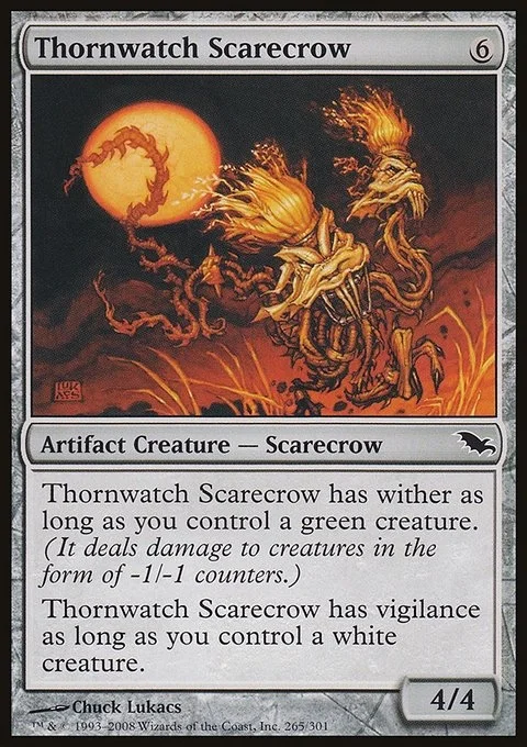 Thornwatch Scarecrow has wither as long as you control a green creature. (It deals damage to creatures in the form of -1/-1 counters.) Thornwatch Scarecrow has vigilance as long as you control a white creature.