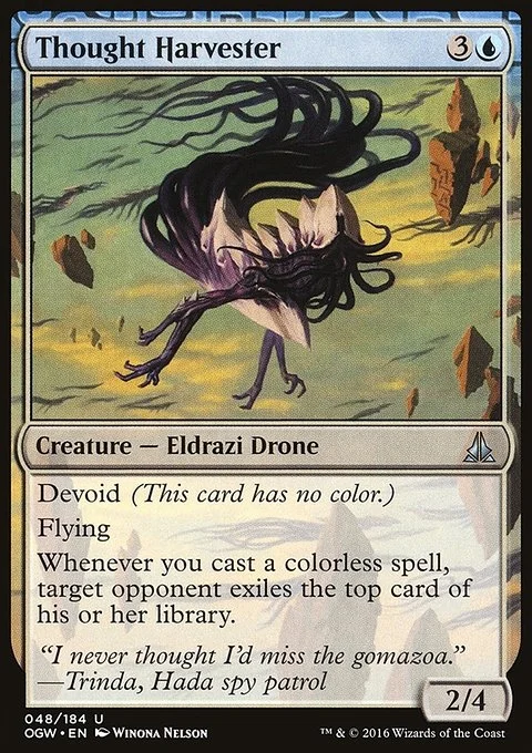 Devoid (This card has no color.) Flying Whenever you cast a colorless spell, target opponent exiles the top card of their library.