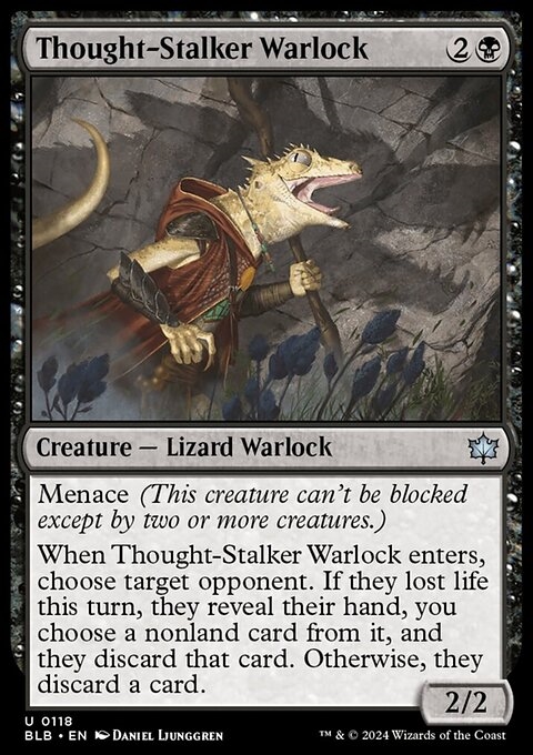 When Thought-Stalker Warlock enters, choose target opponent. If they lost life this turn, they reveal their hand, you choose a nonland card from it, and they discard that card. Otherwise, they discard a card.