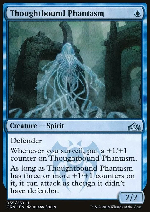 Defender Whenever you surveil, put a +1/+1 counter on Thoughtbound Phantasm. As long as Thoughtbound Phantasm has three or more +1/+1 counters on it, it can attack as though it didn't have defender.
