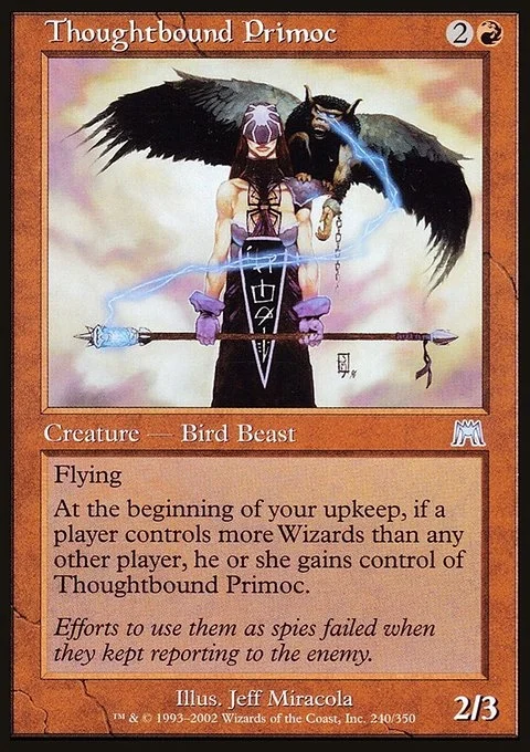 Flying At the beginning of your upkeep, if a player controls more Wizards than each other player, the player who controls the most Wizards gains control of Thoughtbound Primoc.