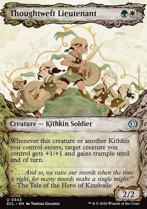 Whenever this creature or another Kithkin you control enters, target creature you control gets +1/+1 and gains trample until end of turn.